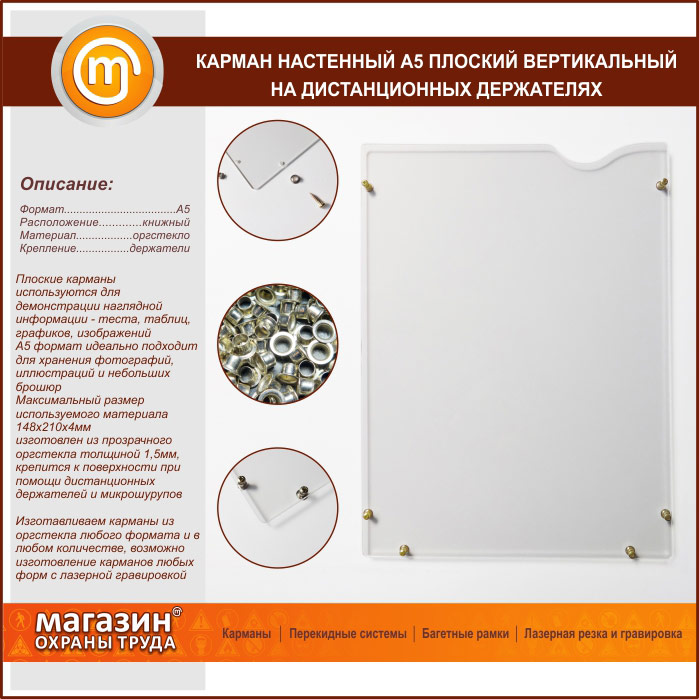 Предлагаем Вашему вниманию настенные плоские вертикальные карманы формата A5 c 3-мя типами крепления – на двустороннем скотче, с бортиками и на дистанционных держателях