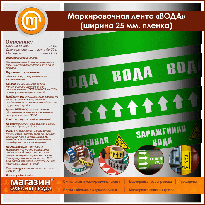 Маркировочная самоклеящаяся лента «ВОДА» имеет ЗЕЛЕНЫЙ цвет и соответствует обозначению, основным компонентом которых является вода. Поставляется погонными метрами длиной от 1 до 50 метров. Изготавливается одноцветной, со стрелками или с наименованием