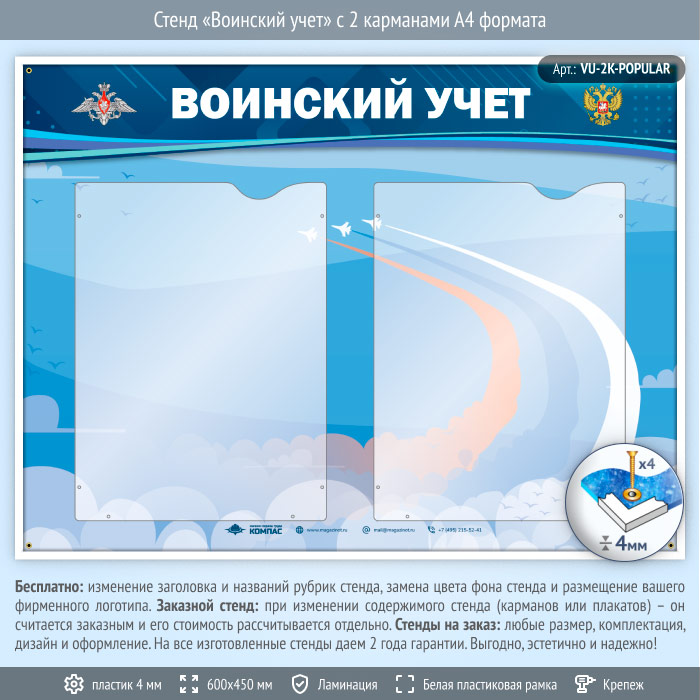 Стенд «Воинский учет» с 2 карманами А4 формата (VU-2K) предназначен для самостоятельного размещения информации – от документов, приказов и инструкций до рекламы... Часто на таких стендах размещают контактные данные, образцы заполняемых бланков, график работы, порядок приема документов в организации и прочее.